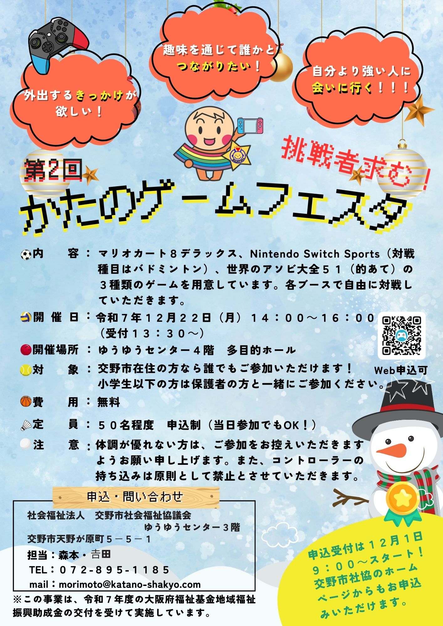 12月22日(月)14:00〜16:00ゆうゆうセンター4階多目的ホールにて「第2回かたのゲームフェスタ」を開催します👏普段おうちで過ごす時間が長い人や、出かけるきっかけがない人、誰かとコミュニケーションを取りたい人など、この機会にぜひ参加してみませんか? 優勝者には表彰状もご用意しています✨ 内容は、下記、チラシをご覧ください🎵 内容:マリオカート8デラックス、Nintendo Switch Sports(対戦種目はバドミントン)、世界のアソビ大全51(的あて)の3種類のゲームを用意しています。各ブースで自由に対戦していただきます。 日時:令和7年12月22日(月) 14:00〜16:00(13:30〜受付) 場所:ゆうゆうセンター4階 多目的ホール 交野市天野が原町5−5−1 対象:交野市在住の方 小学生以下の方は保護者の方と一緒にご参加ください。 参加費:無料 定員:50名程度 申込制 (当日参加でもOK!) 〜注意事項〜 ・当日はトーナメント形式で試合を行います。時間に遅れた場合は、ご希望のブースでトーナメントに参加できない可能性があります。(※遅れたことでまったくプレイができないというものではありません) ・当日、体調が優れない方は参加をお控えください。 ・小学生以下のご参加の場合は、必ず保護者の方も会場内での付き添いをお願い致します。保護者の付き添いがない場合、ご参加をお断りすることがあります。 ・当日、コントローラーの持ち込みはお断りさせて頂いております。以下のコントローラーを使用していただきます。 〇使用コントローラー マリオカート8デラックス‥‥Nintendo Switch Proコントローラー Nintendo Switch Sports‥‥Joy-Con 世界のアソビ大全51‥‥Joy-Con ・ 天候や天災によって直ちにイベントを中止または内容の変更等をしなくてはならない場合があります。その場合はご入力いただきましたメールアドレスへご連絡させていただきます。 ・感染症対策のため、会場内ではマスクの着用してください。 〜申し込み方法〜 下記のURLもしくは二次元コードからお申込ください。 お申込みはコチラ 〜問い合わせ先〜 社会福祉法人 交野市社会福祉協議会 ゆうゆうセンター3階 交野市天野が原町5−5−1 担当:森本・𠮷田 TEL:072−895−1185 mail:morimoto@katano-shakyo.com 詳細チラシ↓ 申込二次元コード↓ |